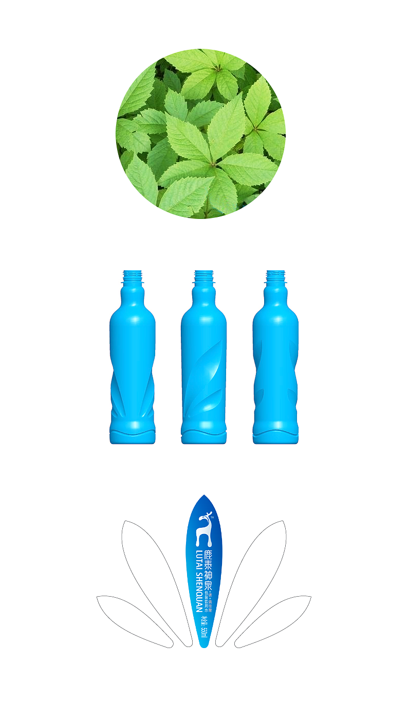 鹿泰神泉的包装及瓶形的创意设计,源于对自然的理解,以五叶草为创意点,五叶草环抱瓶身,浸润绿色纯净之气息,亭亭玉立、端庄典雅。
