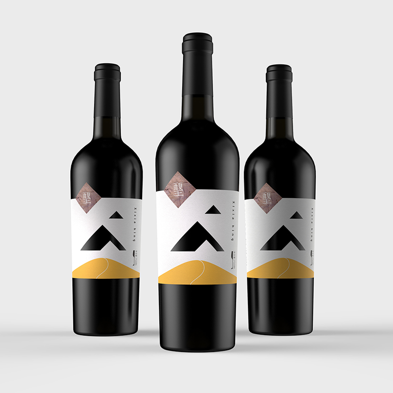 葡萄酒产品的产地非常重要,本设计产品的葡萄产自贺兰山东麓,与法国波尔多产区在一个纬度。贺兰山与沙漠共存的特殊地貌和气候,造就了优质的原料。最终确定用山和沙漠进行创意。瓶标中间山体造型是镂空工艺,透出瓶体,形成远近不同的三座山体图形。同时左上的方形色块底纹为贺兰山岩画图案,色块中西夏王的中文字体创意设计成西夏王朝古文字风格,体现地域文化特色。产品定位针对年轻时尚的成功商务人士,视觉设计个性,产品差异化明显。