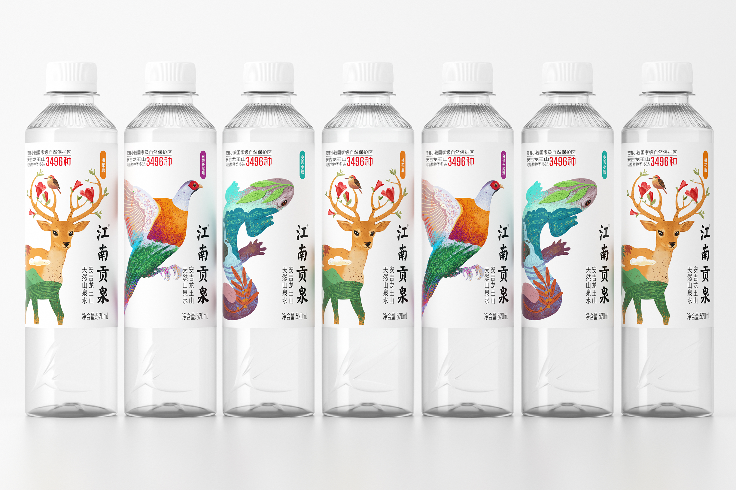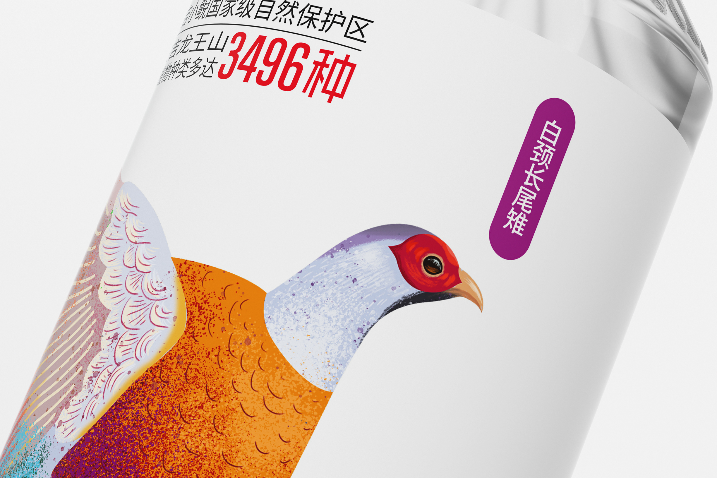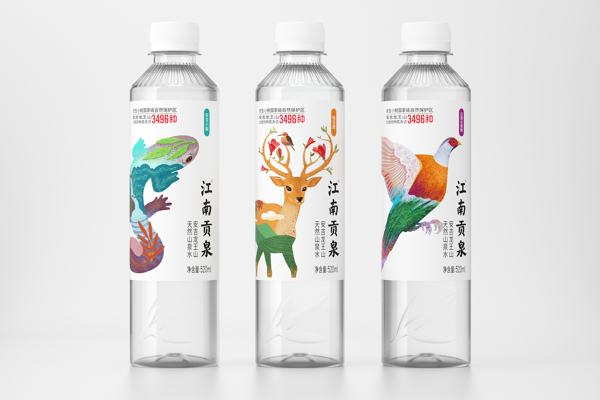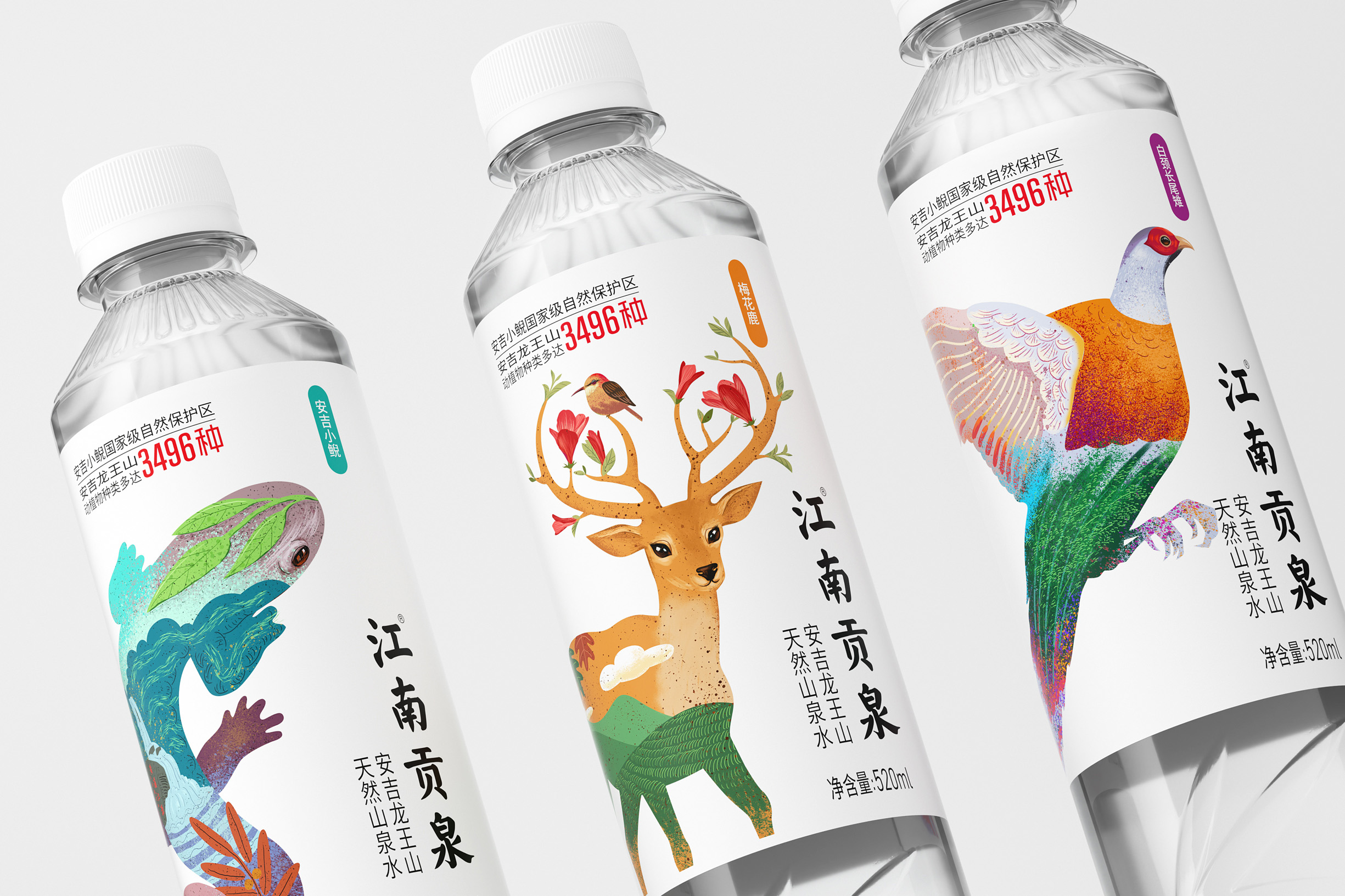 产品系列包装以动植物资源为切入点,表现水源地生态环境地域优势,挖掘筛选出安吉小鲵、梅花鹿、白颈长尾雉等国家保护动物为视觉创作元素,形成自身品牌产品形象识别。