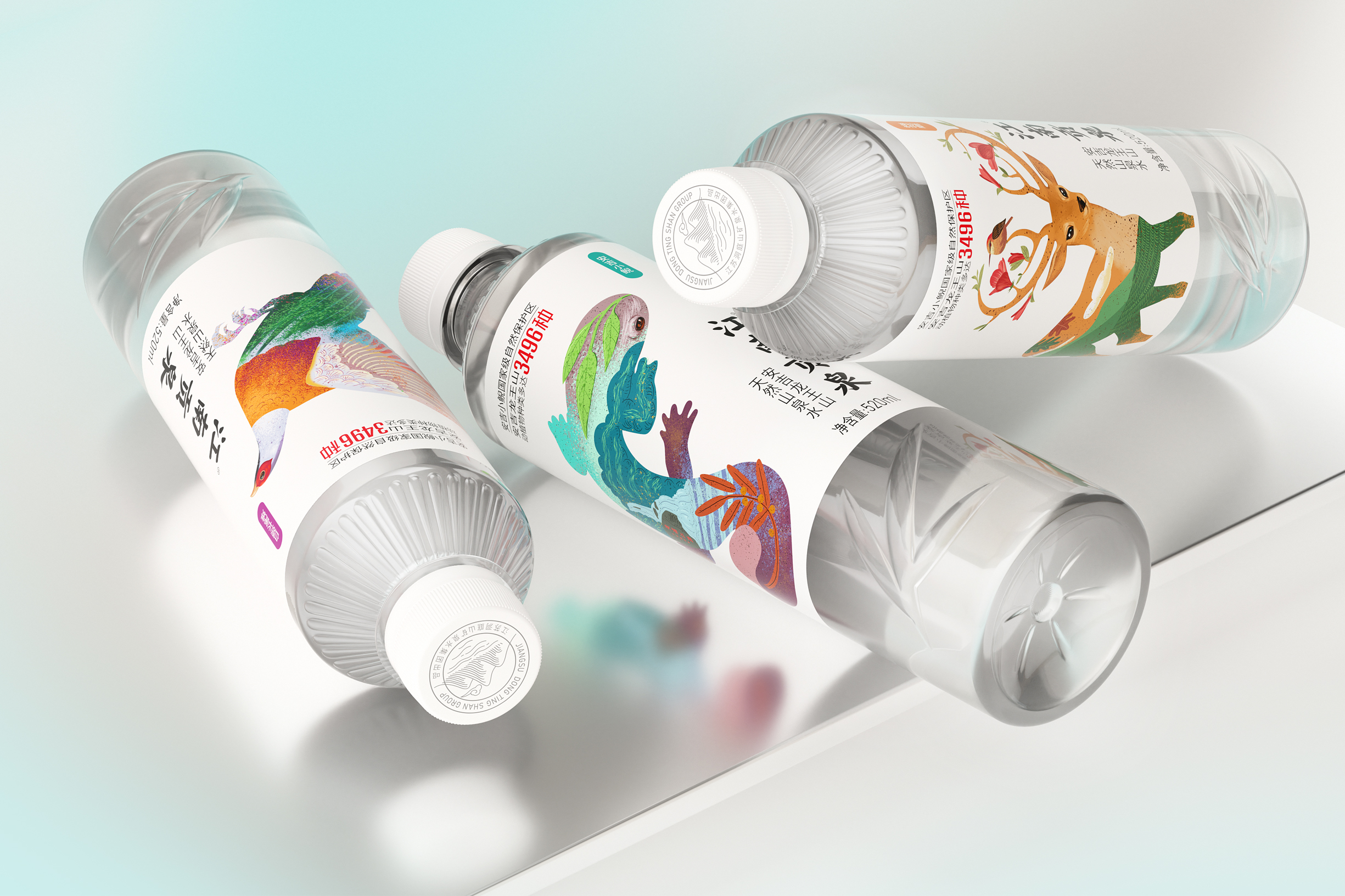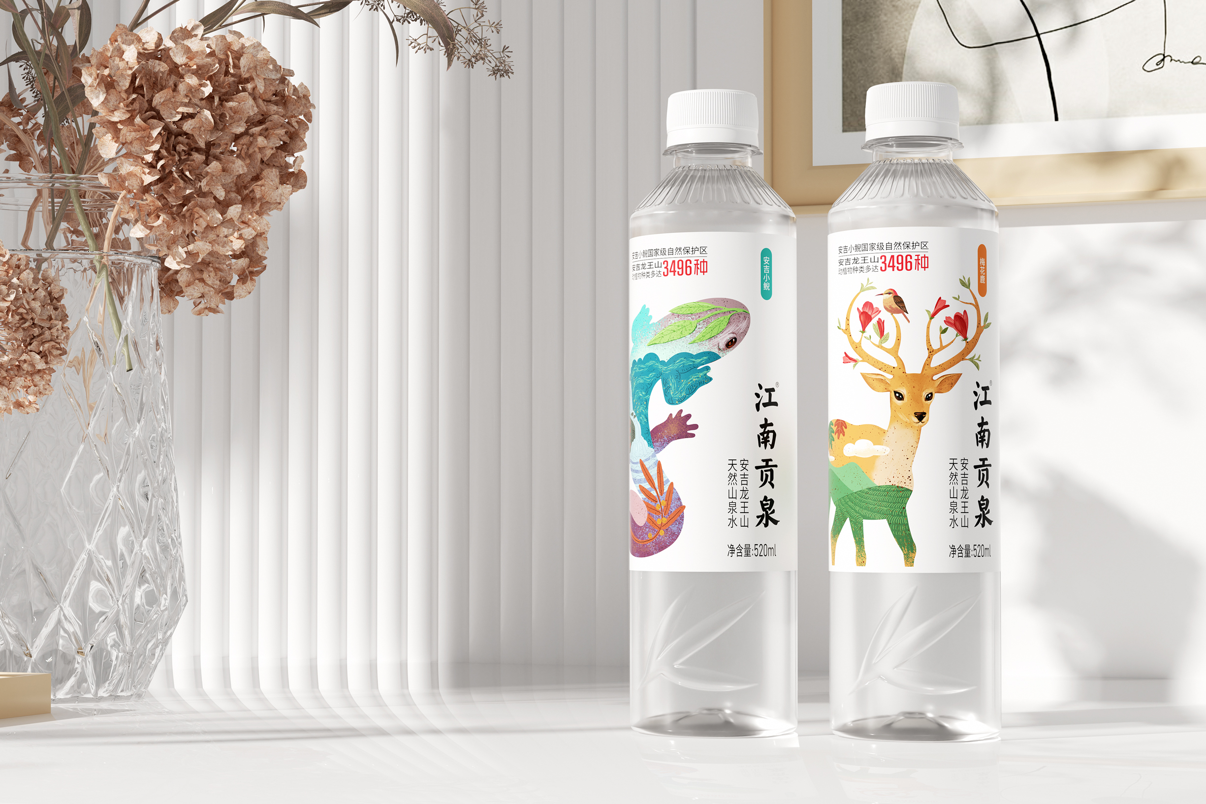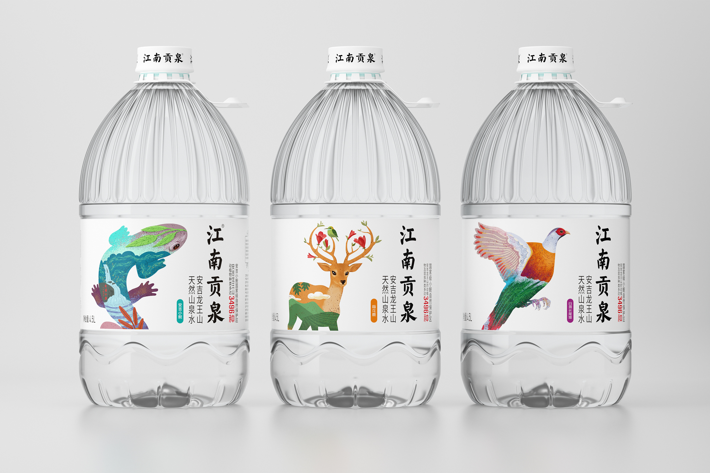 产品系列包装以动植物资源为切入点,表现水源地生态环境地域优势,挖掘筛选出安吉小鲵、梅花鹿、白颈长尾雉等国家保护动物为视觉创作元素,形成自身品牌产品形象识别。