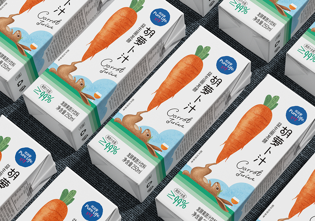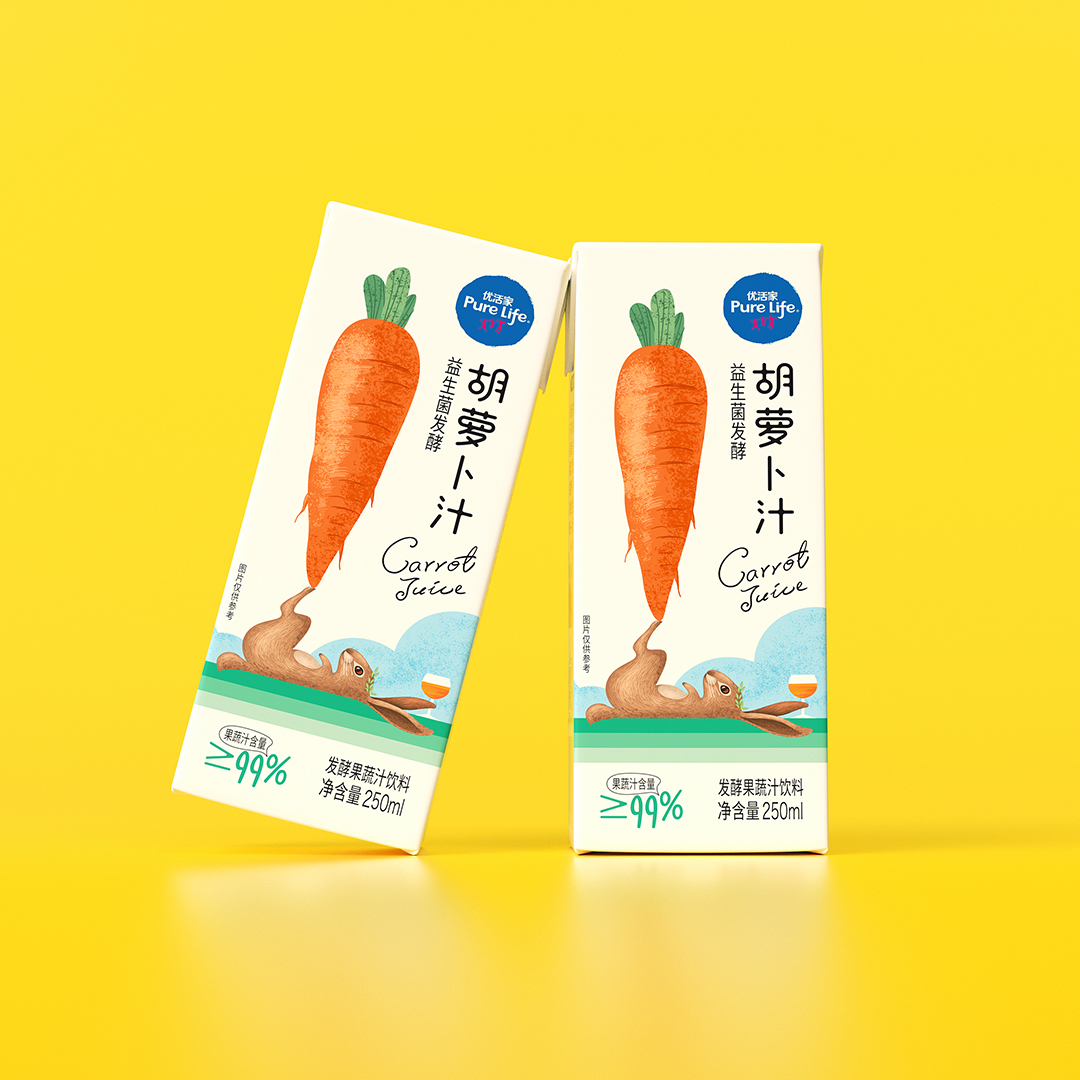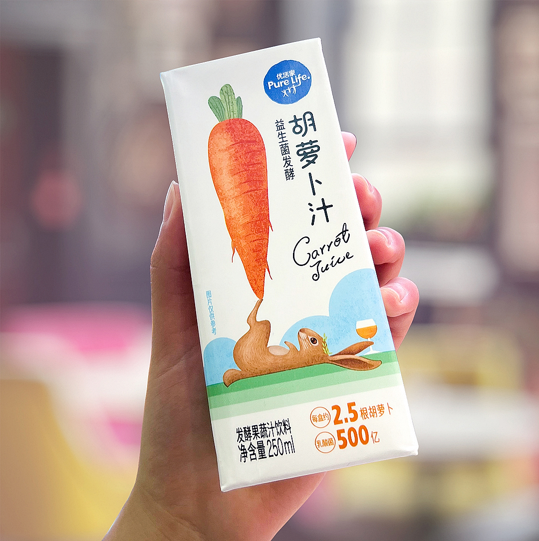 优活家胡萝卜汁每盒相当于2.5根胡萝卜的营养,包装设计主图案采用手绘形式表现,软萌可爱的外表,趣味十足,让人有想要品尝的感受。