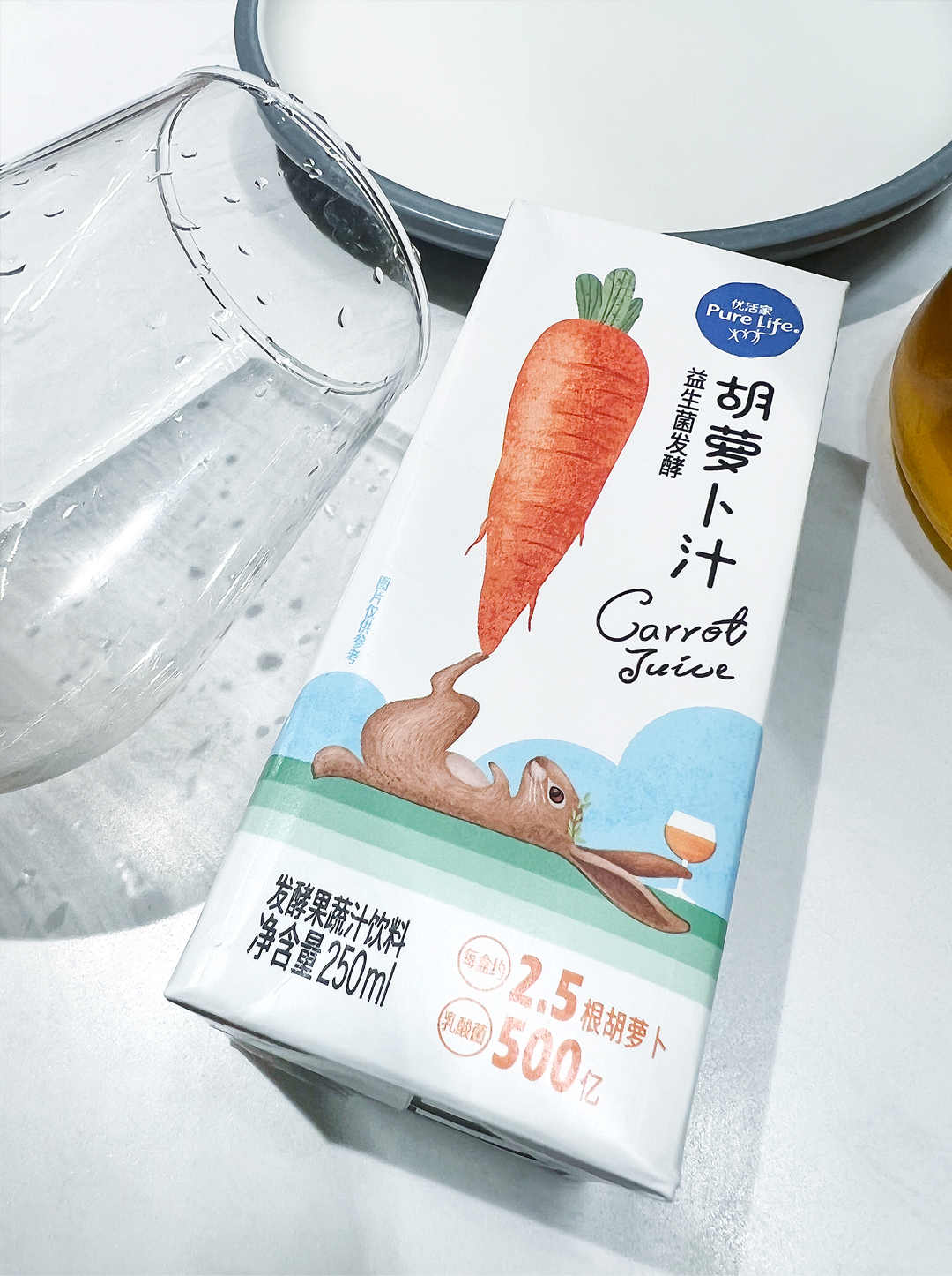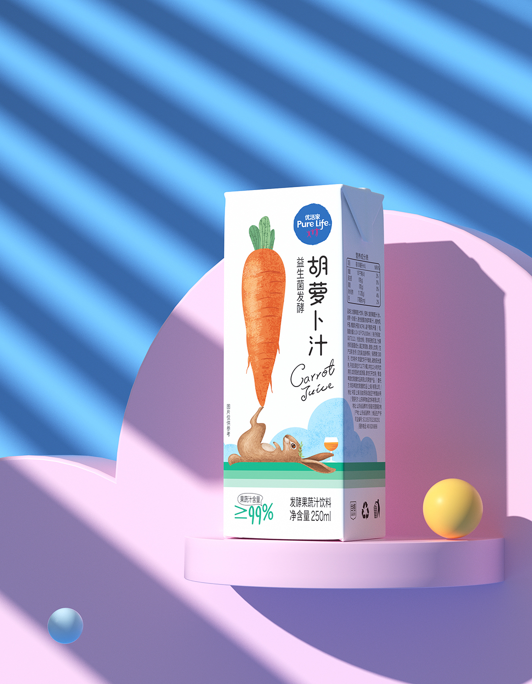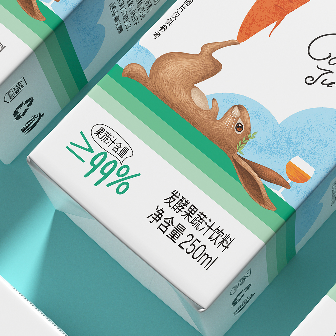 优活家胡萝卜汁每盒相当于2.5根胡萝卜的营养,包装设计主图案采用手绘形式表现,软萌可爱的外表,趣味十足,让人有想要品尝的感受。
