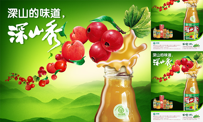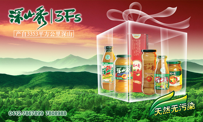 “深山秀”是辽宁鞍山中通公司的旗下品牌,企业专业从事绿色食品的生产与研发,是辽宁省重点绿色食品企业。公司致力在广泛的绿色食品领域中为社会大众提供放心、安全及天然的健康食品。 随着公司快速发展壮大,同时成长的是广大消费者心目中的企业形象。企业"深山秀"、"深山华麟"品牌于2004年12月被辽宁省鞍山市政府授予"鞍山市著名商标"及"鞍山市名牌产品"等称号。"深山秀"系列水果罐头、"深山秀"果汁系列产品2005年7月被中国绿色食品发展中心认定为A级绿色食品。今年会为深山秀创意设计了系列产品宣传海报。